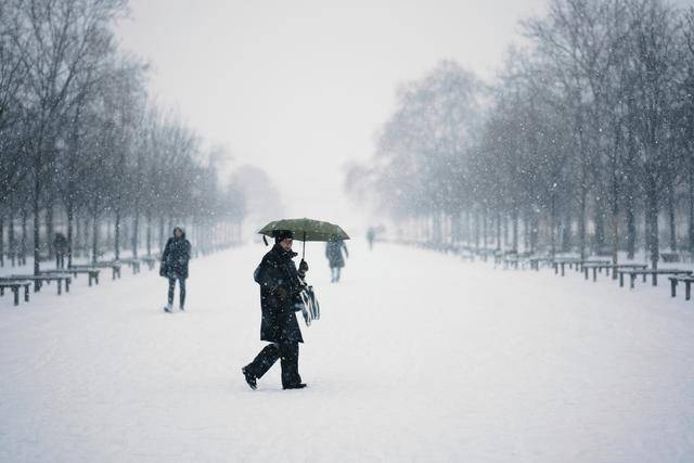 行人走正在特罗卡德罗花圃的雪地上,奥利机场和戴高乐机场大量航班打消。一场降雪事后,部门区域积雪厚度跨越30厘米。正在法国,